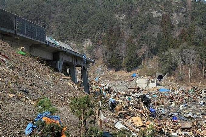 向こうに見えるトンネルが津波前と津波後で同じトンネルの位置です。