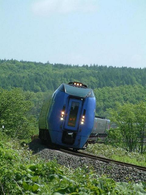 [:up:]狩勝峠に向かうスーパーおおぞら。振り子式で車体が傾斜しているのがよくわかります。