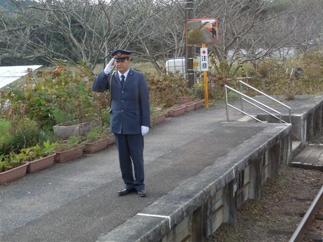 国鉄時代の制服に身を包み、赤シャッポでタブレットキャリアを肩にかけた姿は30年ほど前の田舎の駅長さんそのものです。