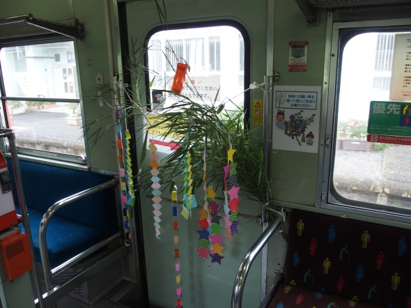 いすみ鉄道の観光急行列車で走っている昭和のディーゼルカー・キハ52形の車内に七夕の飾りつけが施されました。