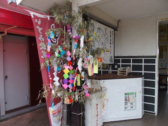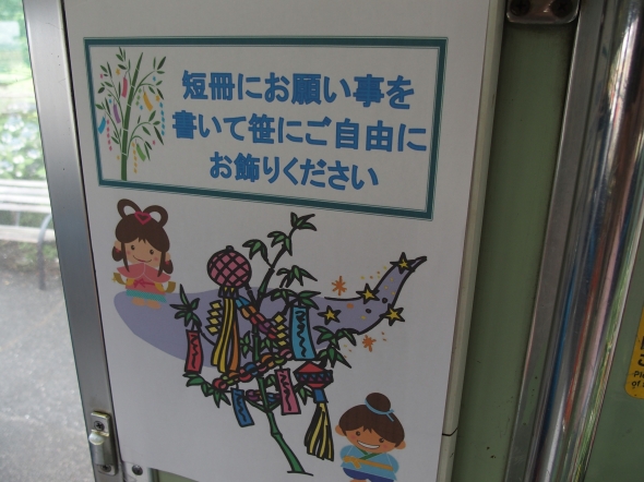 アテンダントのお姉さんたちの発案で、非番の運転士さんが沿線の竹を切ってきたものに、アテンダントさんたちが飾り付けをしただけの簡単な七夕飾りですが、特に予算もない中で、アテのお姉さんたちが自分たちで考えて作ってくれたので、私はとてもうれしく思います。