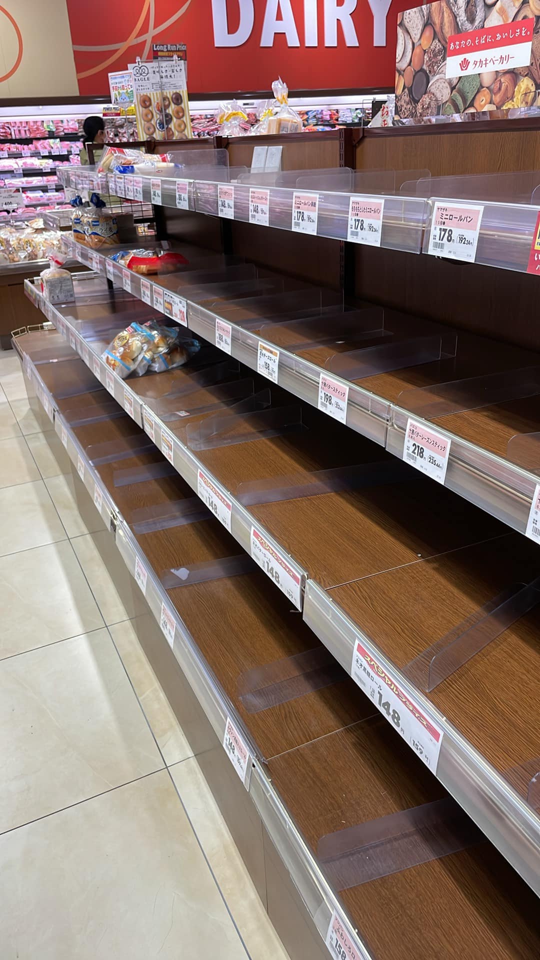 帰りがけにスーパーに立ち寄ったら、パンの棚がスカスカ状態でした。