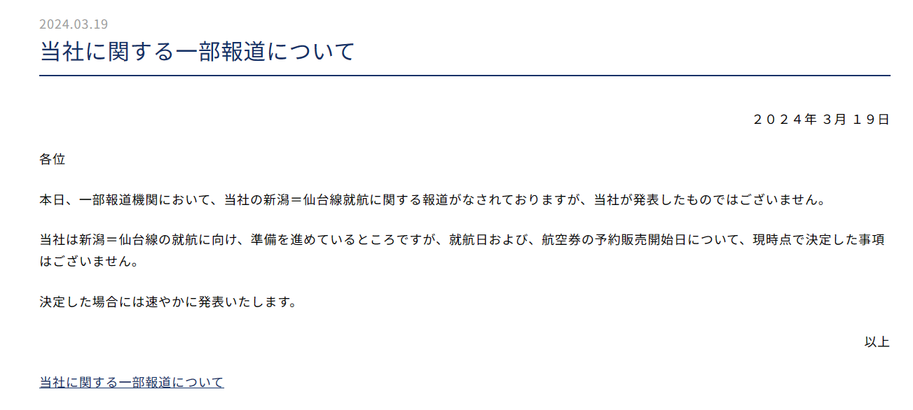 確かに会社のサイトでは新潟-仙台が就航予定路線になっていますからね。