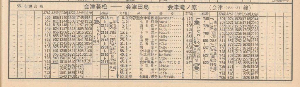 同様に会津田島を6:20に出る仙台行急行「いなわしろ1号」というのも、前の晩22:17に仙台から到着した急行「いなわしろ2号」が一晩停泊して戻っていることがわかります。