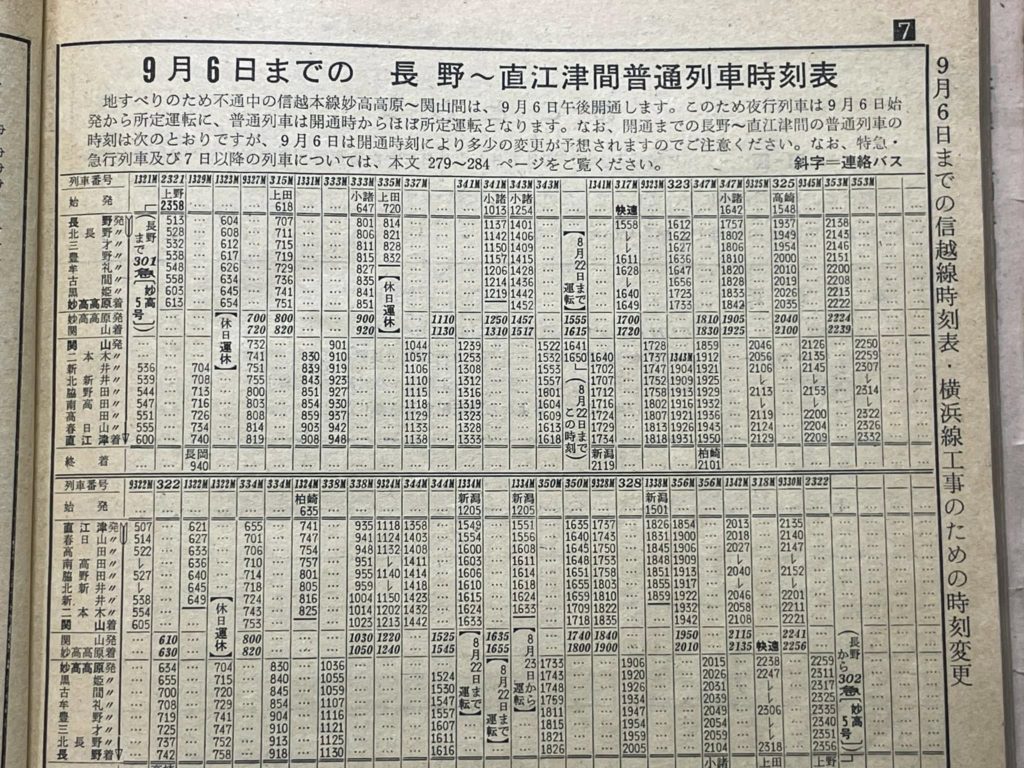 実はこの年の5月18日に妙高高原-関山間の白田切川の上流で大規模な地滑りが発生し、信越本線の線路が流されてしまったのです。その復旧工事がひと夏かけて行われて、9月7日に復旧して列車が走り始めたのです。(夜行列車なので始発駅基準で記載されています。)