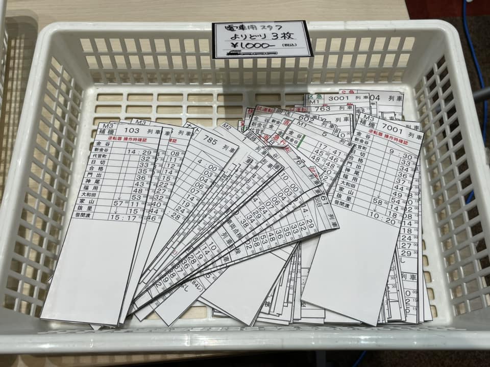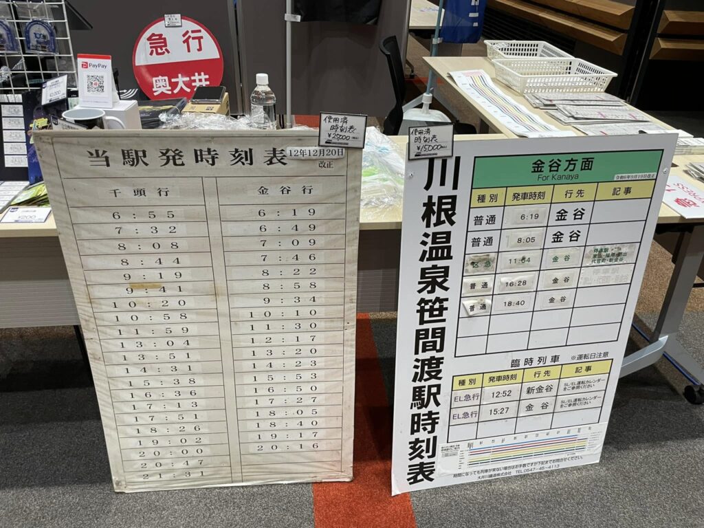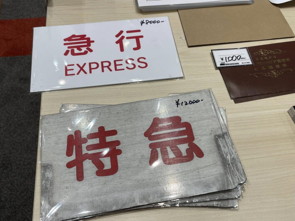 今回の目玉商品は運転士用の時刻表や列車に取り付けていた種別サボなど。