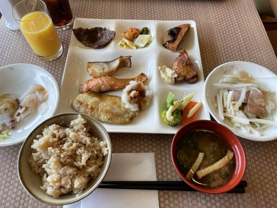 こちらがそのロイヤルインの朝食ですが、何をもって立派なのかというと、これは私の独断と偏見なので異論がある方はスルーしていただきたいのですが、焼き魚が3種類ある。
