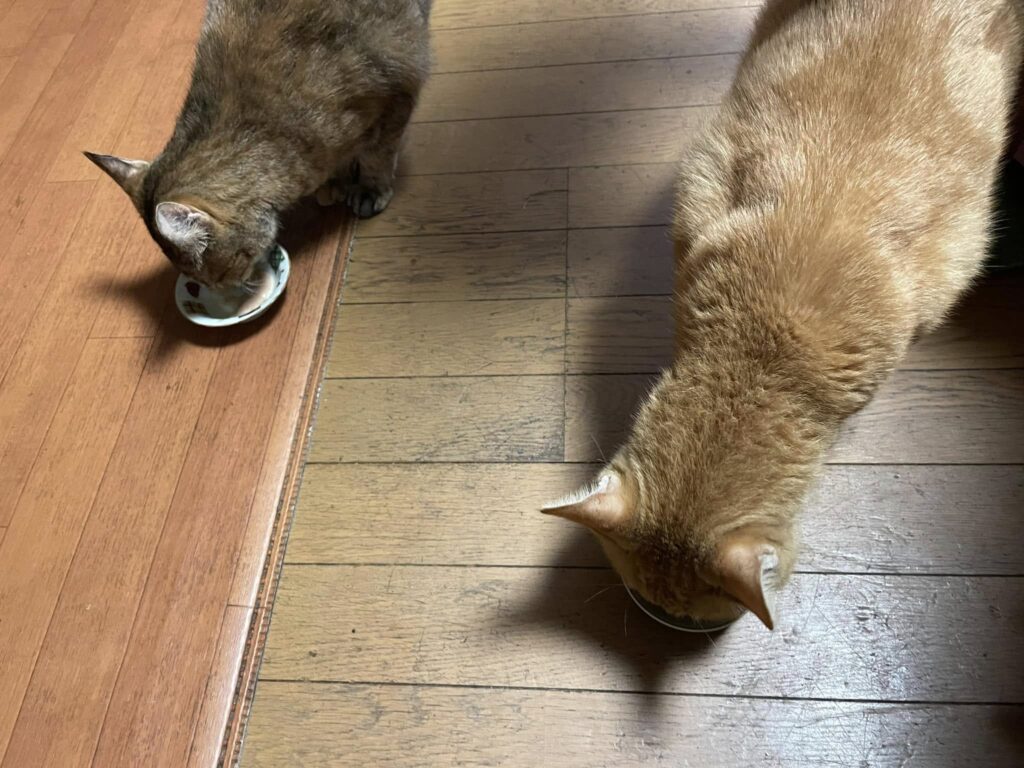そして、「何かくれ」と私の足元に近寄ってくるので、チュールを小皿に取り分けてハイど~ぞ。