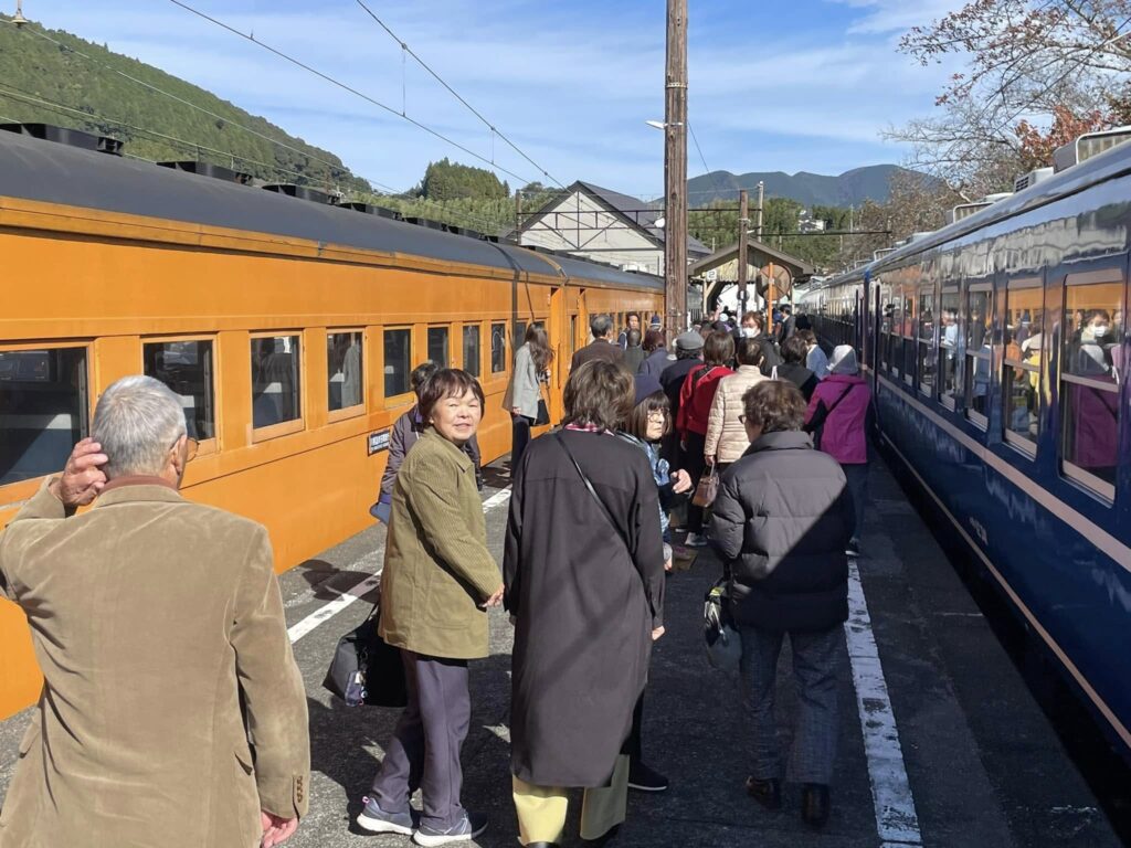 今、川根温泉笹間渡から千頭までの間、3年前の土砂崩れの被害で列車が走っていませんので、観光バスで千頭まで繋げて、そこから井川線で奥大井湖上駅へ行くようなツアーです。