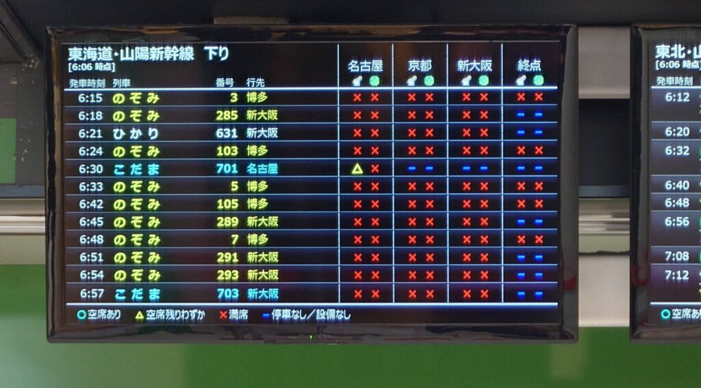 私の友人の水鳥さんが撮影した今朝の東京駅の指定席状況。