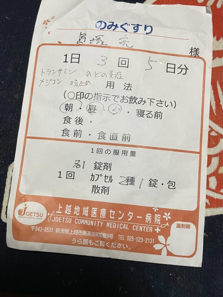 今夜の私は少し風邪気味なものですから、いつだったか上越の病院でもらった薬が薬箱の底から出てきましたので、こいつを飲んで早く寝ようと思います。