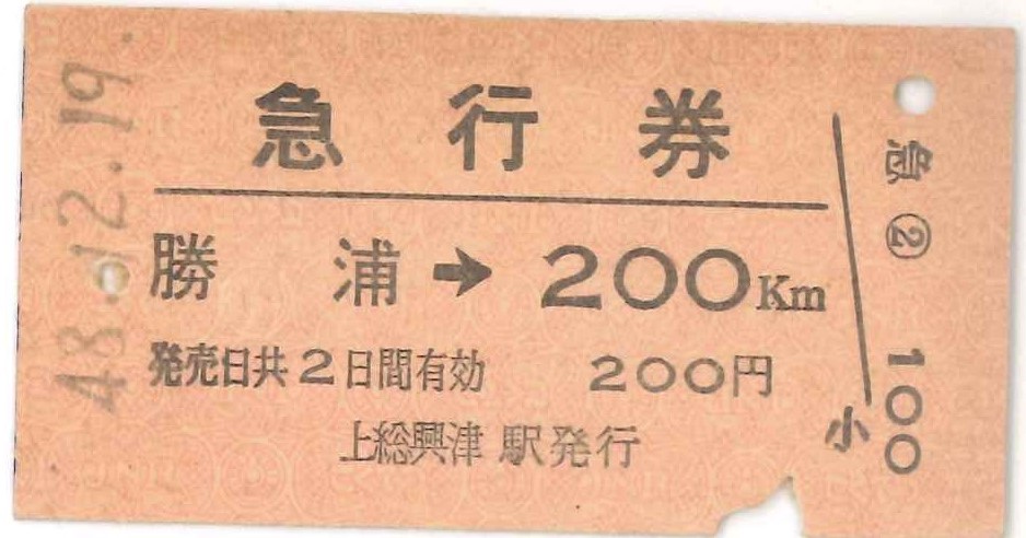 急行料金は100kmまで(100円)と200kmまで(200円)、そして201km以上(300円)の設定でしたから、勝浦まで急行列車にするとわずか数キロで急行料金が倍になったのです。