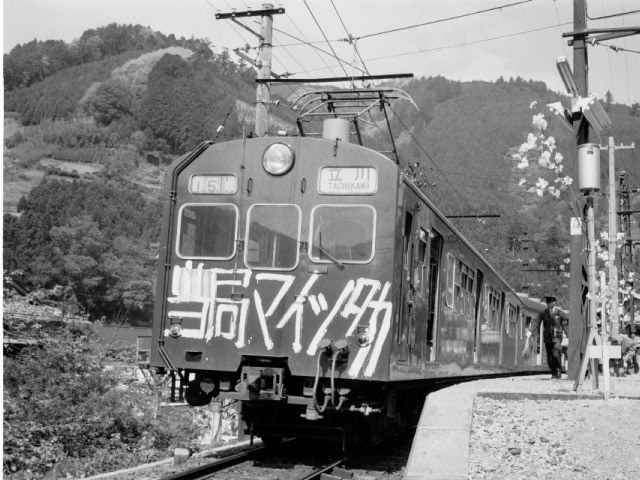 昭和47年(1972年)のゴールデンウィークが始まった時、私がカメラを持って青梅線の撮影に行った時ですが、直前にストライキは解除されて電車は走っていましたが、落書きはそのままでした。