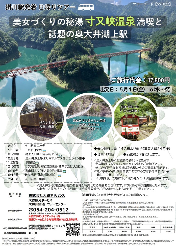 そこで、そんな皆様方を楽々この湖上駅へお連れして、もちろん井川線のトロッコ列車にもご乗車いただいて、奥大井の秘湯、寸又峡温泉に入って、夢のつり橋を見て、さらに大井川鐵道の昭和のブルートレイン「EL急行」にもご乗車いただける日帰りツアーバスが設定されています。