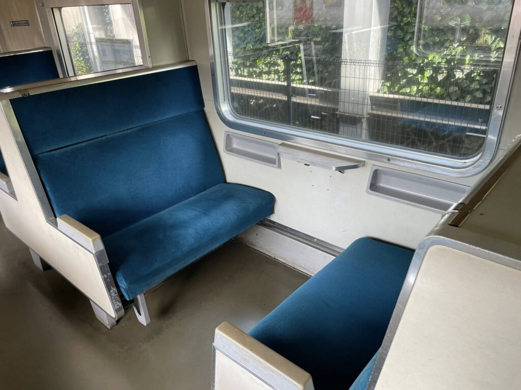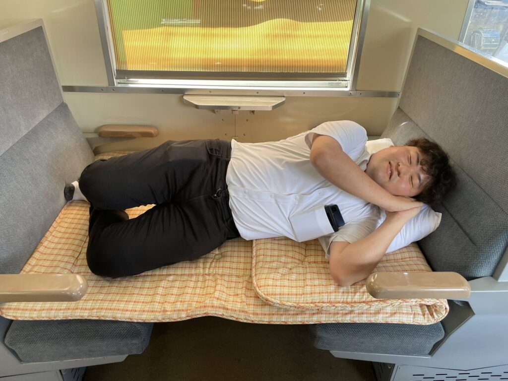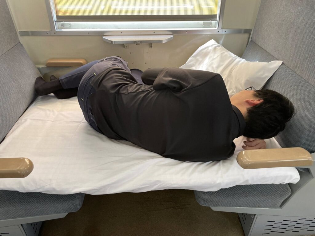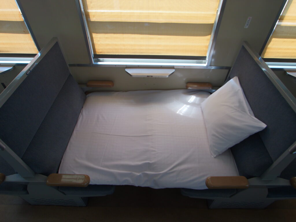 少しシートピッチは広いものの、なんだか急行みたいだと当時は思っていましたが、どうして向かい合わせかというと、この電車は昼間は座席車として走って、夜になると寝台車に早変わりするんです。