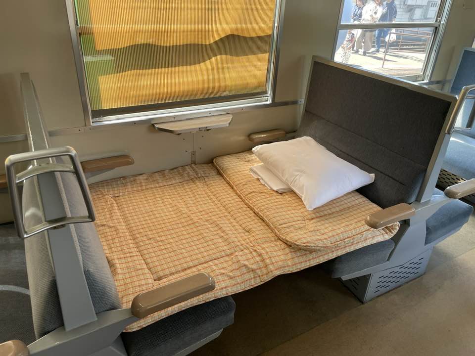実際にはこうやっていろいろ寝具を置いておきますので、自分でセッティングしてくださいねの世界ではありますが、新型プルマン式簡易寝台車の出来上がりです。